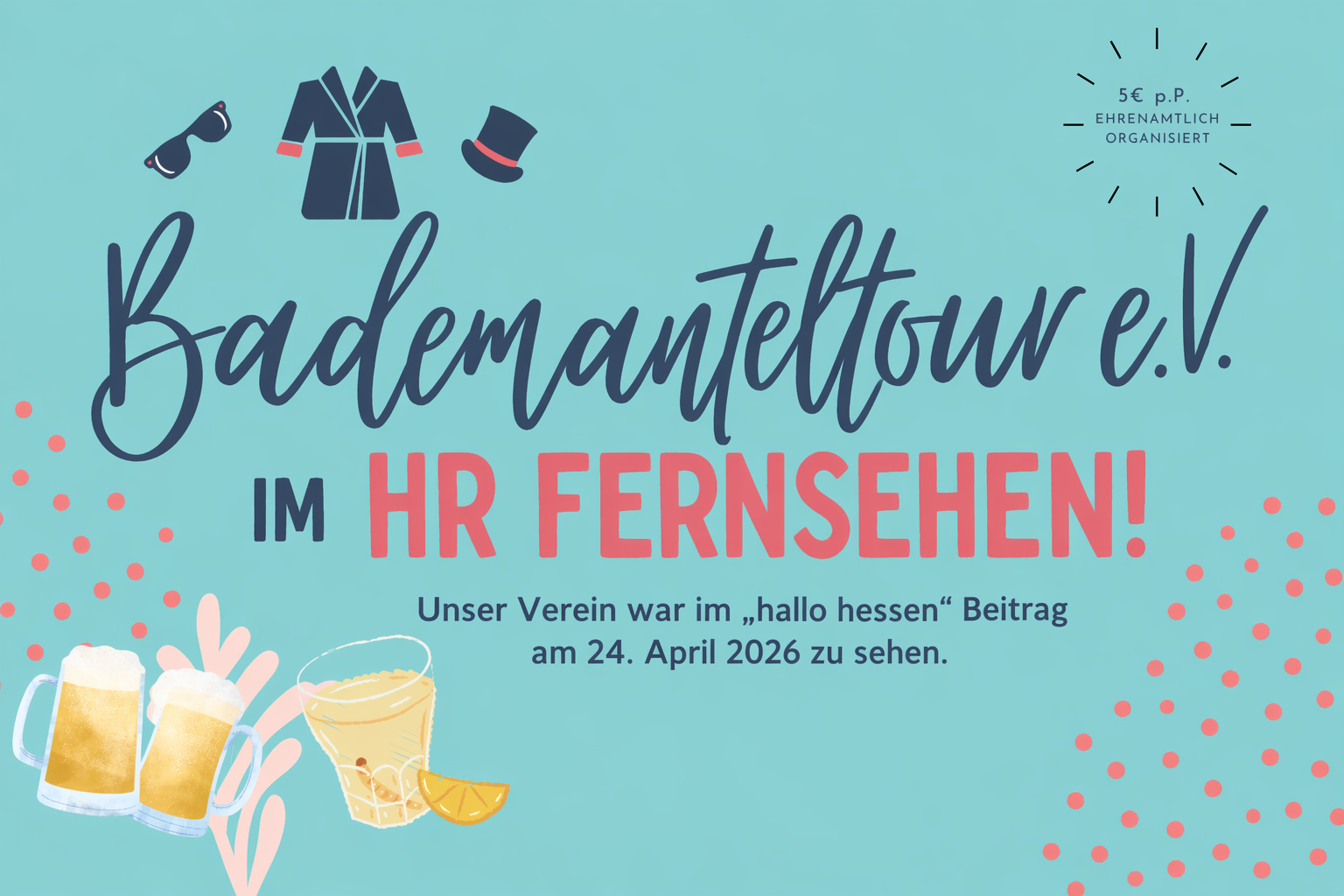 Große Freude beim Bademanteltour e.V.: Unser Verein war am 24. April 2026 im HR Fernsehen in der Sendung hallo hessen zu sehen. Der Beitrag zeigt unsere besondere Idee und die einzigartige Atmosphäre unserer Veranstaltung, die mittlerweile viele begeisterte Teilnehmerinnen und Teilnehmer anzieht.
